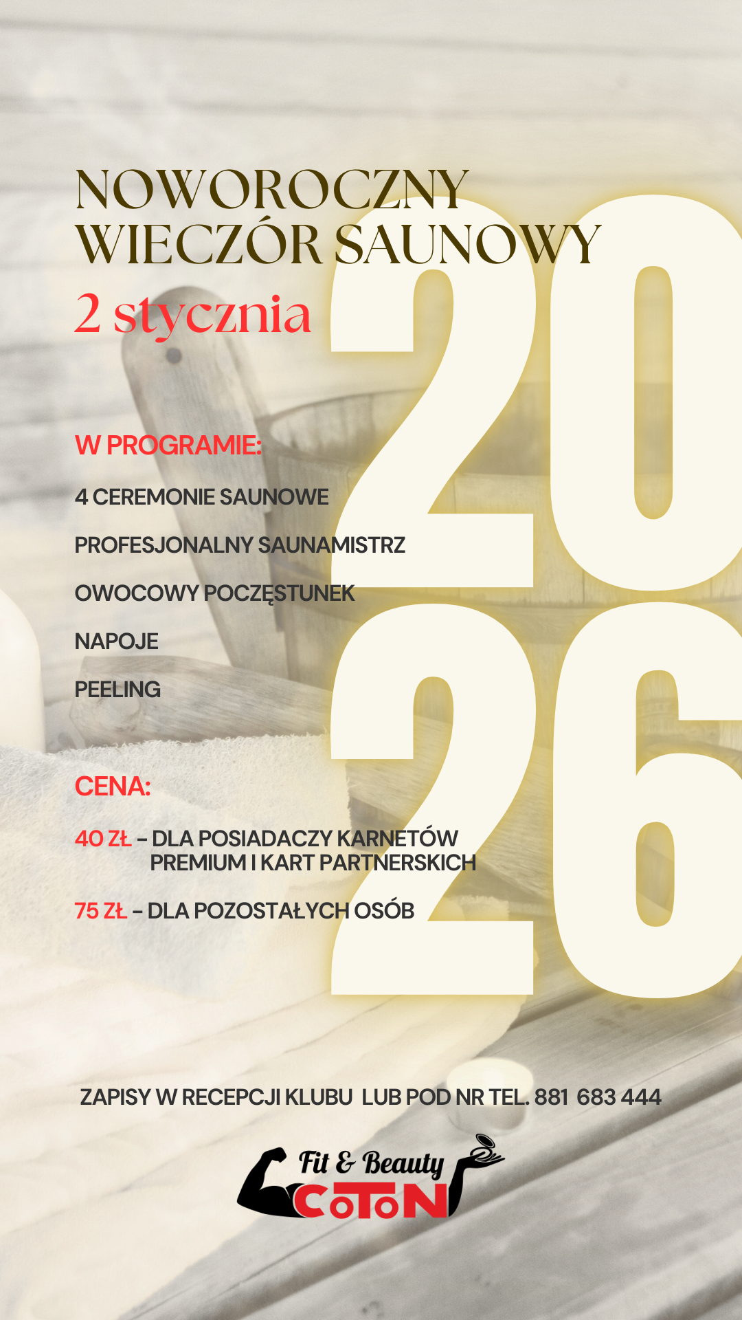 Już 2 stycznia zapraszamy Cię na Noworoczny Wieczór Saunowy w Coton Fit & Beauty – wieczór pełen ciepła, aromatów i regeneracji dla ciała i głowy.